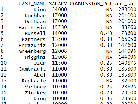 # 정렬도 하자 emp %>% select(LAST_NAME,SALARY,COMMISSION_PCT) %>% mutate(ann_sal = SALARY*12+ifelse(is.na(COMMISSION_PCT),0, SALARY*COMMISSION_PCT))%>% arrange(desc(ann_sal)) |
