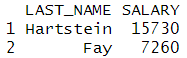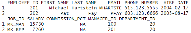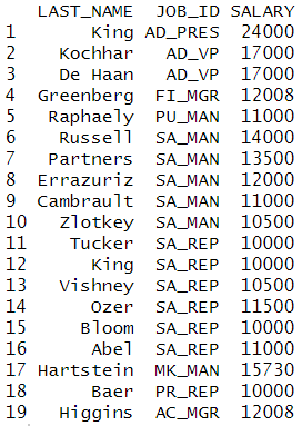 # 출력 컬럼 지정 filter(emp, DEPARTMENT_ID==20)[,c('LAST_NAME','SALARY')] |