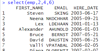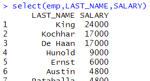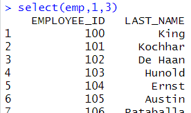 # 기본 사용법 select(emp,LAST_NAME,SALARY) select(emp,1,2) |