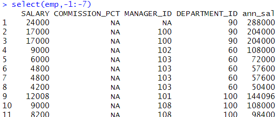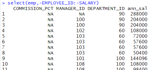 # 컬럼 이름으로 출력 컬럼 제외 select(emp,-EMPLOYEE_ID:-SALARY) |