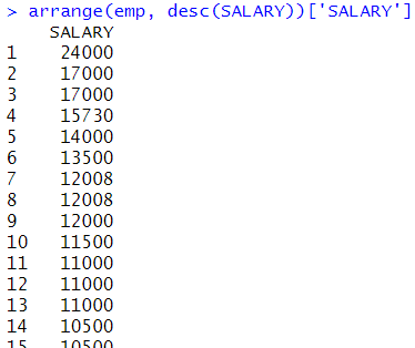 | arrange(emp,DEPARTMENT_ID,desc(SALARY))[c('DEPARTMENT_ID','SALARY')] | ![]() |