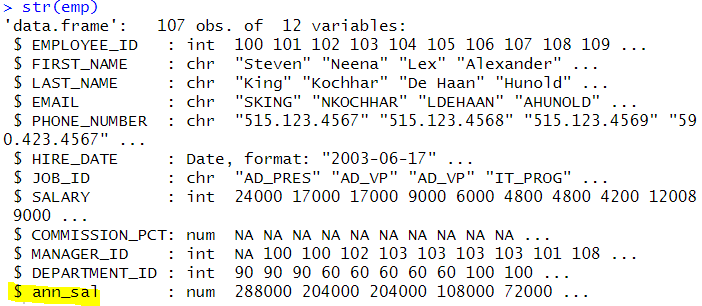 | emp <- mutate(emp,ann_sal=SALARY*12) str(emp) |