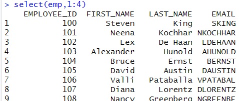 # 출력 컬럼 슬라이싱 select(emp,1:4) |