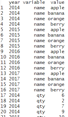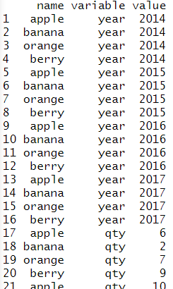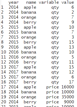 # 두개의 컬럼을 기준으로 묶기 melt(sales, id=c('year','name')) |