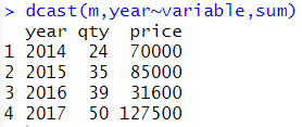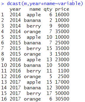 # 기본 사용법 m <- melt(sales, id=c('year','name')) dcast(m,year+name~variable) |