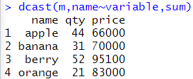 # name컬럼을 기준으로 합 구하기 dcast(m,name~variable,sum) |