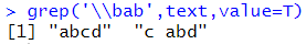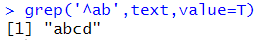 # ^ : 시작되는 문자를 찾는다. grep('^ab',text,value=T) |
