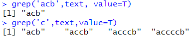 # 해당 값으로 출력 grep('acb',text, value=T) |