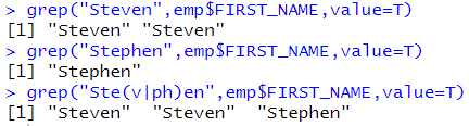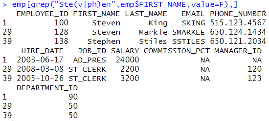 # 활용 emp[grep("Ste(v|ph)en",emp$FIRST_NAME,value=F),] |