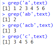 # 해당 인덱스 번호로 출력 text <- c('a','ab','acb','accb','acccb','accccb') grep('a',text) grep('ab',text) grep('acb',text) grep('c',text) |
