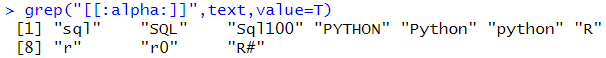 # 문자를 찾는다.(특수문자는 제외) grep("[[:alpha:]]",text,value=T) |