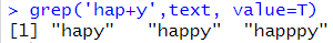# + : 적어도 1번이상 grep('hap+y',text, value=T) |
