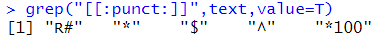 # 특수 문자를 찾는다. grep("[[:punct:]]",text,value=T) |