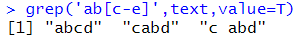 # [n-m] : n부터 m까지 문자 매칭 grep('ab[c-e]',text,value=T) |