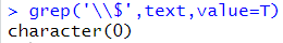 # \\$ : '$' 문자 매칭 grep('\\$',text,value=T) |