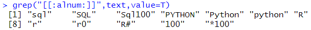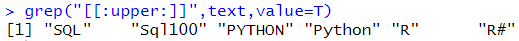 text <- c("sql", "SQL", "Sql100", "PYTHON", "Python", "python", "R", "r", "r0", "R#", "100", "*", "$", "^", "*100") |
