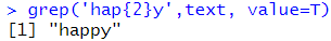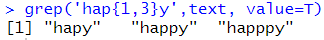 # {n,m} : n번부터 m번까지 매칭하면 찾는다. grep('hap{1,3}y',text, value=T) |