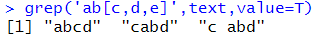 # [...] : 리스트 안에 있는 문자 매칭 grep('ab[c,d,e]',text,value=T) |