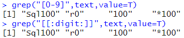 # 숫자를 찾는다. grep("[0-9]",text,value=T) grep("[[:digit:]]",text,value=T) |