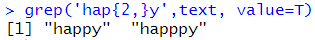 # {n} : n번 매칭하면 찾는다. grep('hap{2}y',text, value=T) |