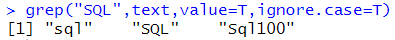 # 대소문자 구분 없이 찾고 싶을때 grep("SQL",text,value=T,ignore.case=T) |