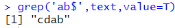 # $ : 끝나는 문자를 찾는다. grep('ab$',text,value=T) |