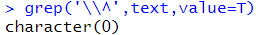 # \\^ : '^' 문자 매칭 grep('\\^',text,value=T) |