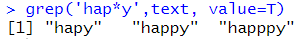 # * : 적어도 0번이상 grep('hap*y',text, value=T) |