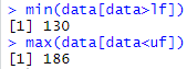 # box plot에 값 나타내기 boxplot(data) text(1.1,min,min,col='blue') text(1.3,q1,q1,col='blue') text(1.3,q2,q2,col='blue') text(1.3,q3,q3,col='blue') text(0.7,min(data[data>lf]), min(data[data>lf]),col='blue') text(0.7,max(data[data<uf]), max(data[data<uf]),col='blue') text(1.1,max,max,col='blue') |