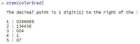 # red 컬럼 줄기잎그림으로 만들기 stem(color$red) |