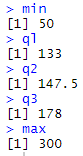 # 사분위값 각 변수에 저장 min <- as.numeric(quantile(w)[1]) q1 <- as.numeric(quantile(w)[2]) q2 <- as.numeric(quantile(w)[3]) q3 <- as.numeric(quantile(w)[4]) max <- as.numeric(quantile(w)[5]) |
