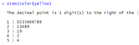 # yellow 컬럼 줄기잎그림으로 만들기 stem(color$yellow) |