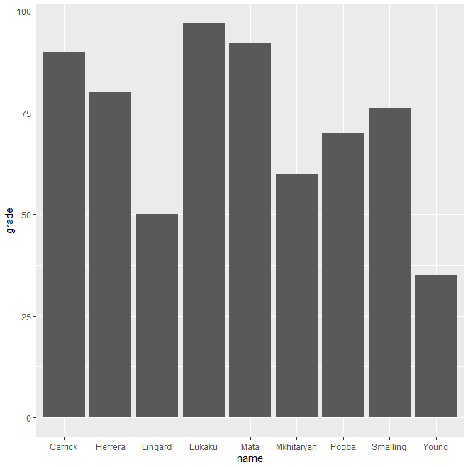 # geom_bar() : 막대그래프 그리기 ggplot(x,aes(x=name,y=grade))+ geom_bar(stat="identity") |