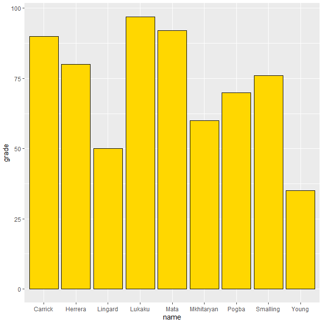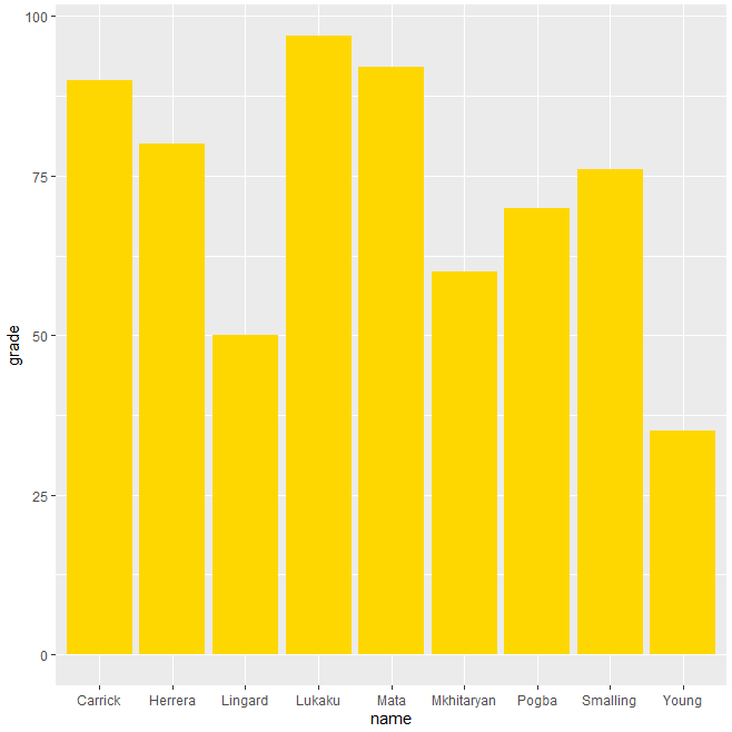 # bar에 색깔 채우기 ggplot(x,aes(x=name,y=grade))+ geom_bar(stat="identity",fill="gold") |