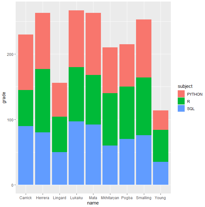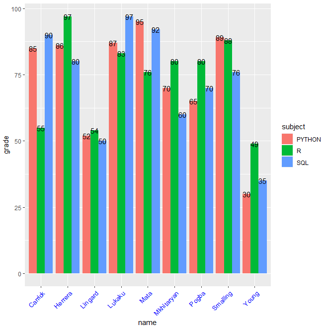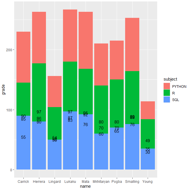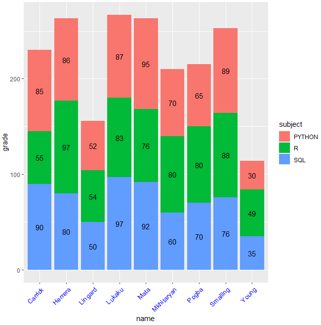 | ggplot(df,aes(x=name,y=grade,group=subject))+ geom_col(aes(fill=subject),position="stack")+ geom_text(aes(label=grade), position=position_stack(vjust=0.5))+ theme(axis.text.x=element_text(angle=45, colour="blue",size=10, hjust=1,vjust=1)) |