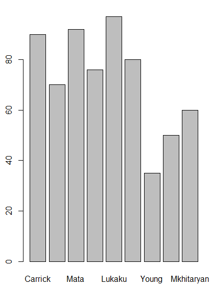 # 일반 parblot을 사용한 막대그래프 그리기 barplot(x$grade,names.arg=x$name) |