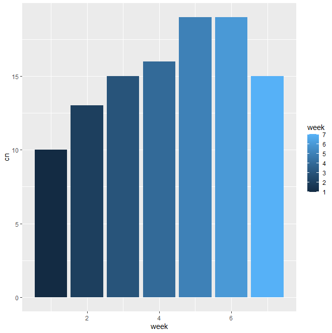 # factor를 사용하지 않아서 x축 값이 듬성듬성나옴 ggplot(week_cn,aes(x=week,y=cn,fill=week))+ geom_bar(stat="identity") |