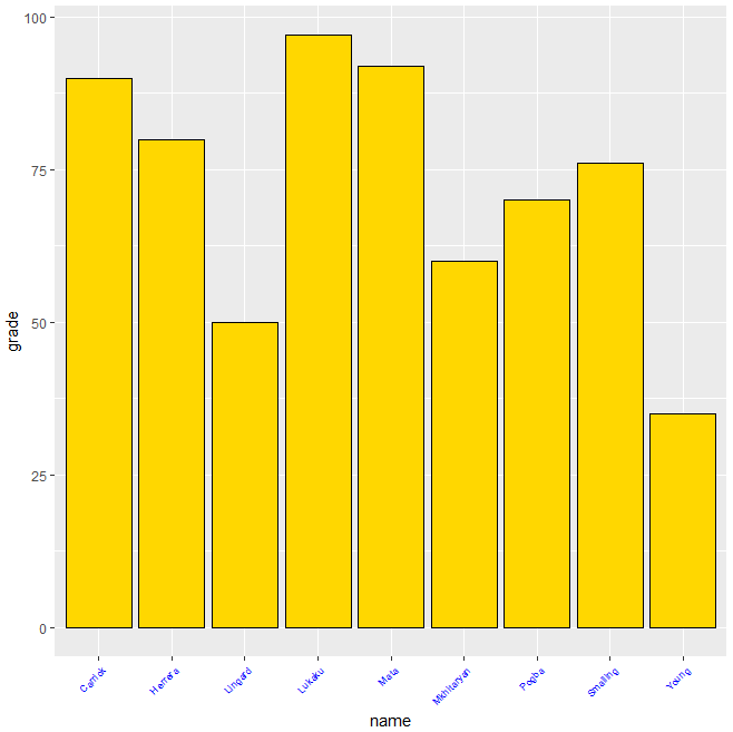 # theme(axis.text.x= ) : x축의 테마 변경 ggplot(x,aes(x=name,y=grade))+ |