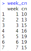 # 요일별 입사한 인원수 데이터 library(plyr) week_cn <- count(emp,"wday(HIRE_DATE,week_start=1)") week_cn colnames(week_cn) <- c("week","cn") |