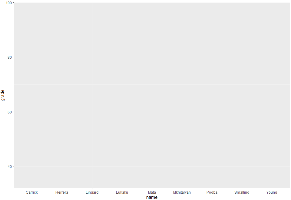 # ggplot을 사용한 그래프 배경 생성 ggplot(x,aes(x=name,y=grade)) |