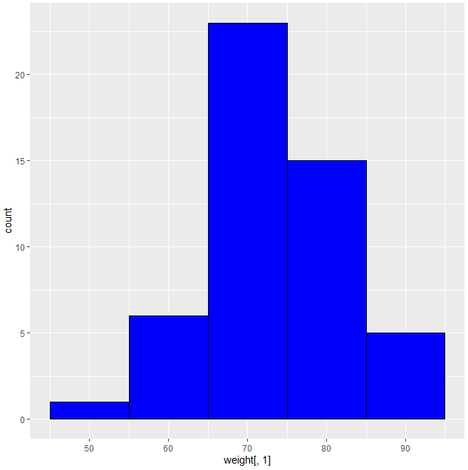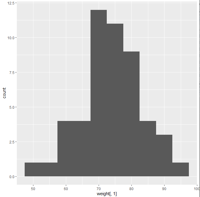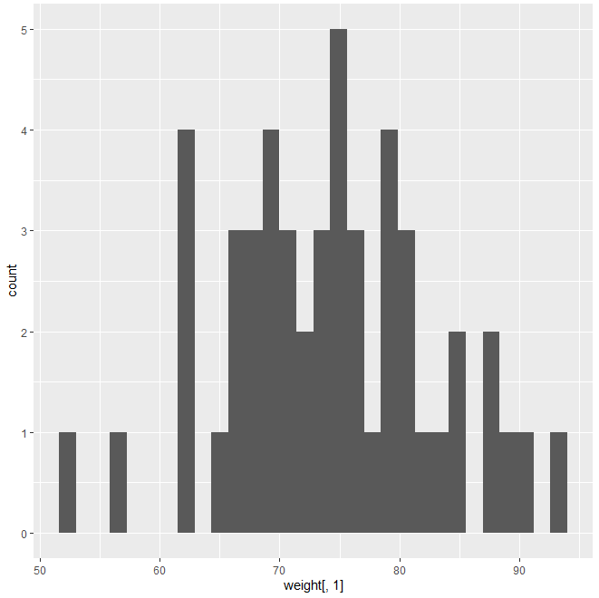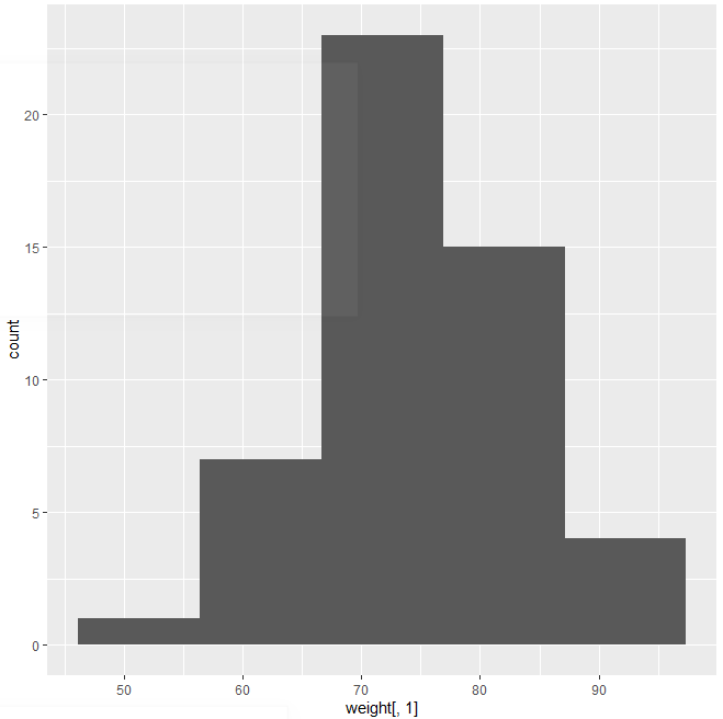 # bins 개수가 많으면 binwidth는 좁다 ggplot(weight,aes(x=weight[,1]))+ geom_histogram(binwidth=5) |