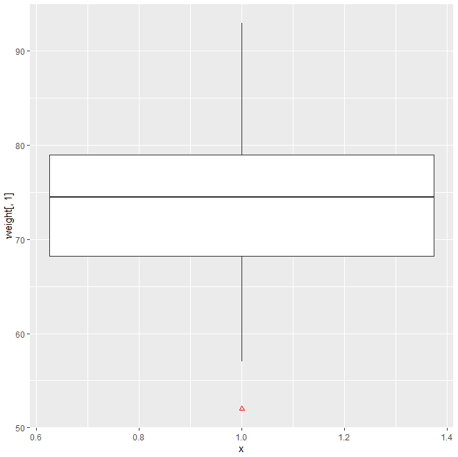 # 이상치 설정 바꾸기 ggplot(weight,aes(x=1,y=weight[,1]))+ geom_boxplot(outlier.color = "red", outlier.shape = 2) |