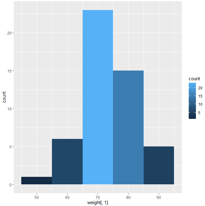 # 색채우기 ggplot(weight,aes(x=weight[,1]))+ geom_histogram(binwidth=10,aes(fill=..count..)) |