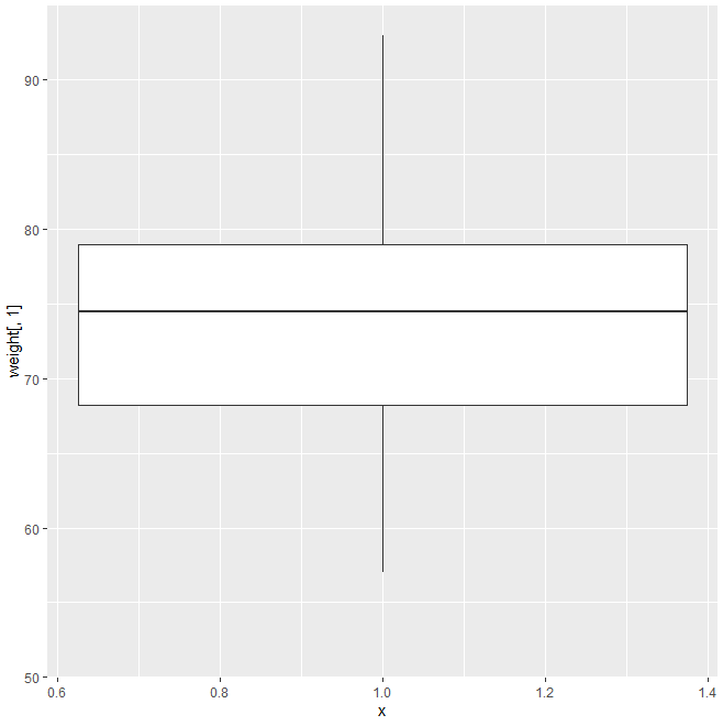 # 이상치 제거 ggplot(weight,aes(x=1,y=weight[,1]))+ geom_boxplot(outlier.shape = NA) |