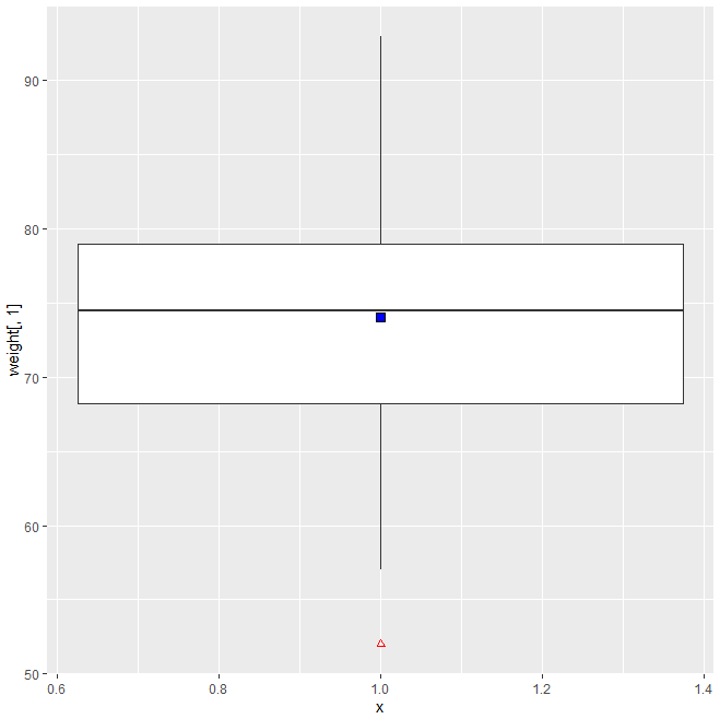 # 평균값 꾸미기 ggplot(weight,aes(x=1,y=weight[,1]))+ geom_boxplot(outlier.color = "red", outlier.shape = 2)+ stat_summary(fun.y="mean",geom="point",shape=22, size=3,fill="blue") |