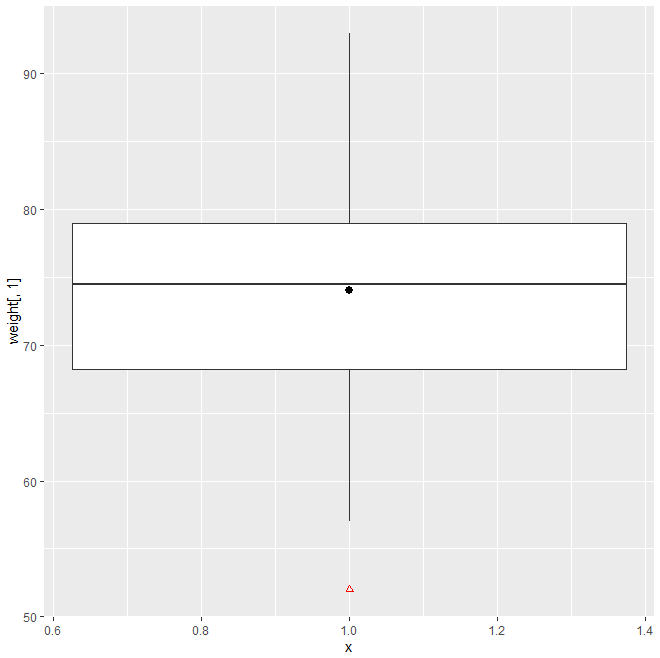 # 평균값 보기 ggplot(weight,aes(x=1,y=weight[,1]))+ geom_boxplot(outlier.color = "red", outlier.shape = 2)+ stat_summary(fun.y="mean") |