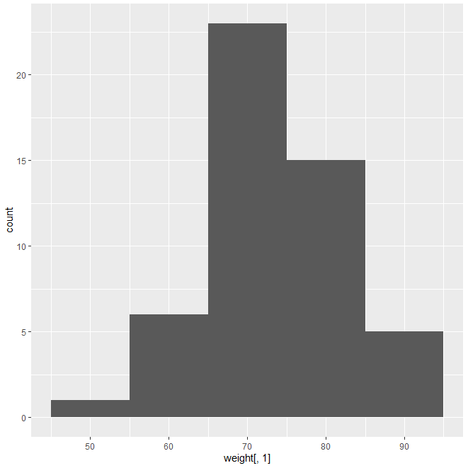 # bins를 설정해서 빠진 구간이 없게 하자 ggplot(weight,aes(x=weight[,1]))+ geom_histogram(bins=5) |