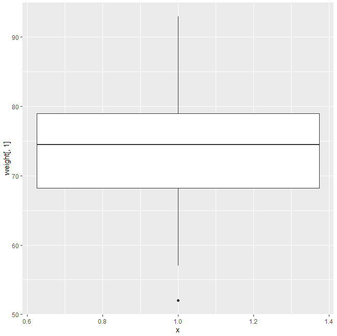# 기본 사용법 ggplot(weight,aes(x=1,y=weight[,1]))+ geom_boxplot() |