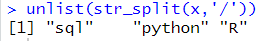 # 리스트 -> 벡터모양으로 바꾸기 unlist(str_split(x,'/')) |