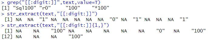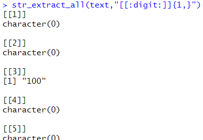 # simplify : 행렬로 변환 str_extract_all(text,"[[:digit:]]{1,}", simplify=T) |